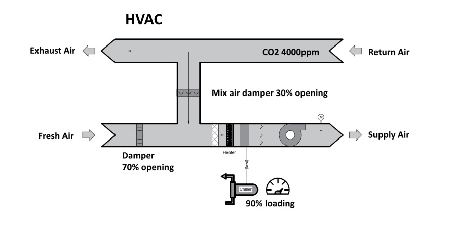 Normal HVAC system, the return air with high concentration of CO2.  The mixing damper only open about 20% to return the air back to the building. The HVAC needs to pass large amount of fresh air to the building.  The loading of chiller is high.  Energy consumption is large.